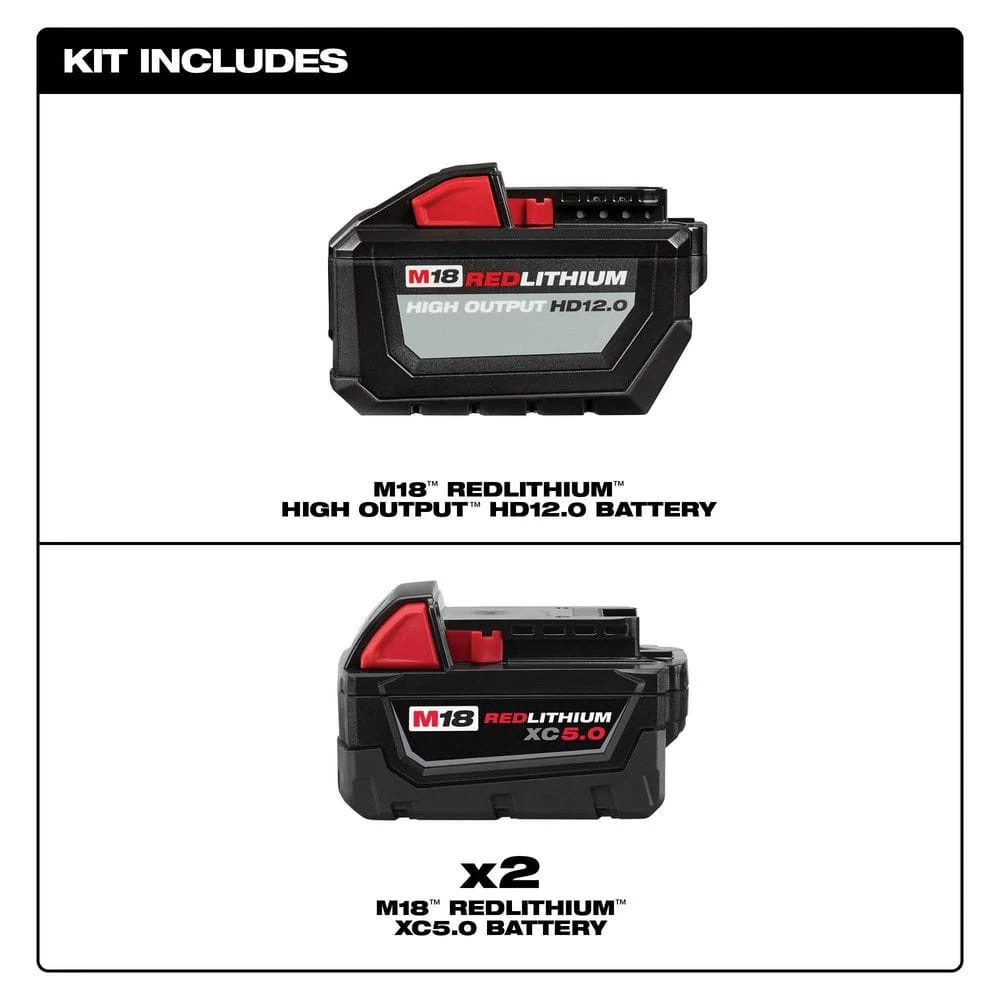- Includes: 1 M18 high output 12.0 Ah battery (48-11-1812), two M18 5.0 Ah batteries (48-11-1850)