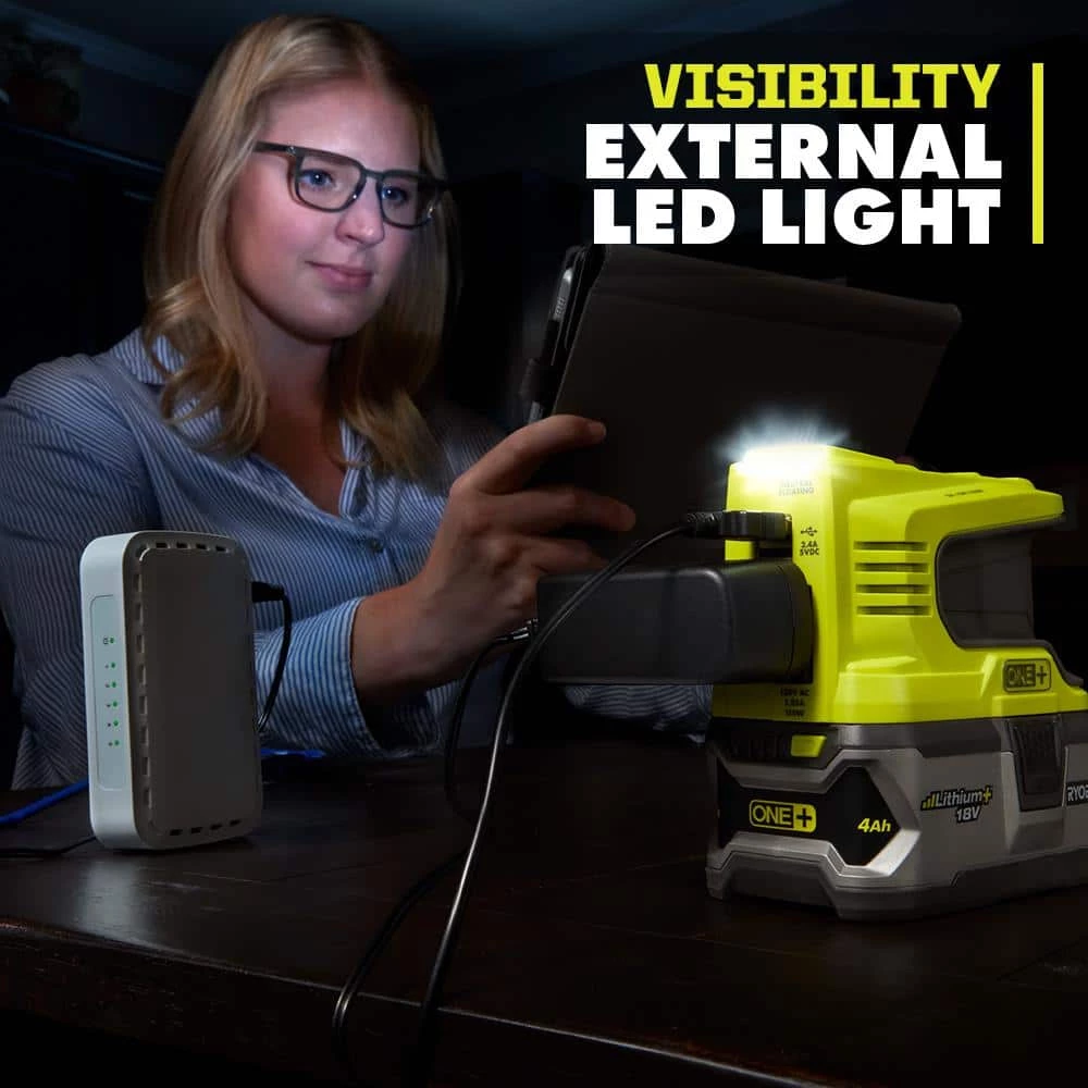 The RYOBI 18V ONE+ Power Source provides convenient, on-the-go power both on and off the jobsite. With a modified sine wave and 150-Watt of continuous output, this inverter is perfect for powering laptops, tablets, cell phones and other small electronics. This compact and lightweight design is compatible with all of your existing RYOBI One+ batteries making endless power even easier. Equipped with 2 USB outlets and one 120-Volt wall outlet for convenient and reliable power.