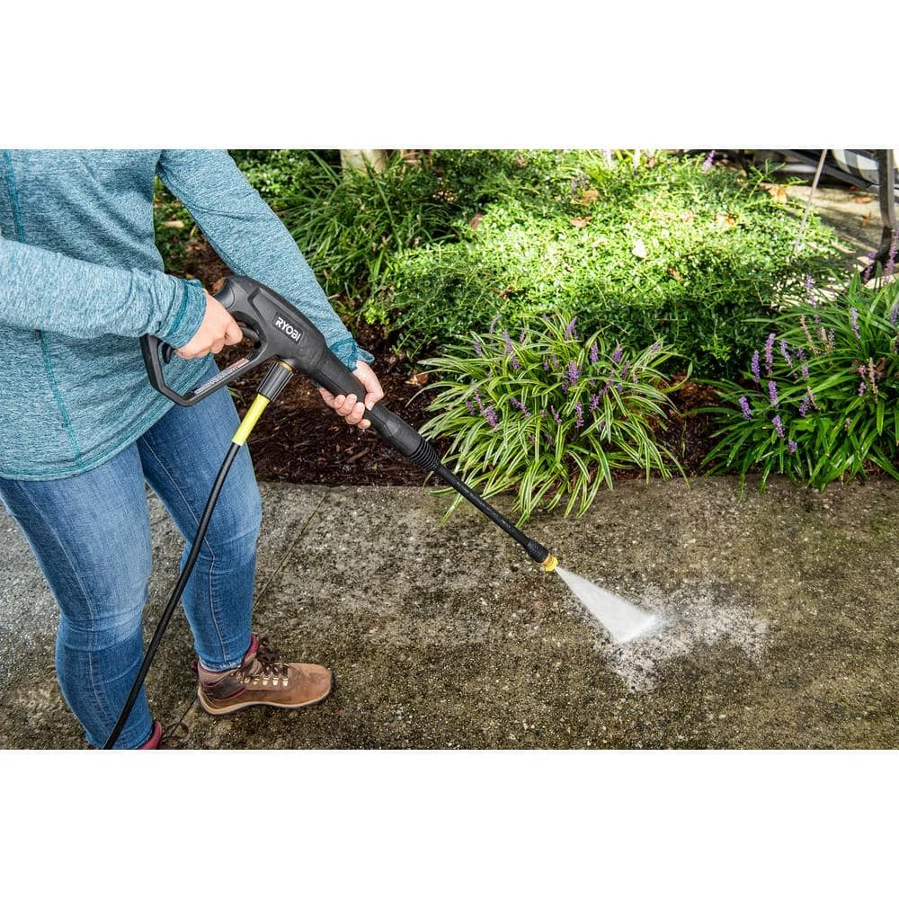 The RYOBI 1800 PSI 1.2 GPM Electric Pressure Washer is the perfect powerful yet portable option to get the job done. This pressure washer is ideal for light duty applications like cleaning small driveways, sidewalks, decks, windows, patio furniture, campers, bikes, boats, and many other recreational applications. This unit comes with a 15° nozzle and turbo nozzle, which cleans up to 50% faster than a standard nozzle. Not only is the pressure washer lightweight and portable, but the included 20 ft. ultra flex hose is 50% lighter, reducing fatigue and allowing for easy maneuverability. Attach the soap applicator for a deeper clean when detergent is needed on tough messes. The spray wand and nozzles use 1/4″ quick-connect. The compact design allows for convenient storage in smaller spaces. The RYOBI 1800 PSI 1.2 GPM Electric Pressure Washer is backed by a 3-year limited warranty.