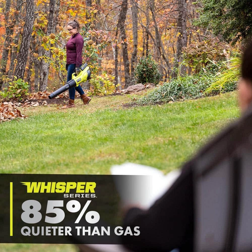 This 40-Volt HP WHISPER SERIES Blower delivers incredible power without the noise! Delivering 600 CFM and 155 MPH this blower can tackle wet and dry leaves. It is a part of our WHISPER SERIES of products and is 85% quieter than a gas blower! Giving you all the power without the noise. This blower is loaded with premium features like a variable speed trigger to blow in more delicate areas, cruise control to reduce fatigue during extended use, a turbo button for maximum power, and a speed tip attachment to increase your air speed for heavier debris. All of these features combine to provide you with ultimate control to meet your needs. This kit is equipped with a 40-Volt 4.0 Ah battery and charger. The battery is compatible with the RYOBI 40-Volt system. The 40-Volt HP WHISPER SERIES Jet Fan Blower is backed by a 5-year tool warranty.