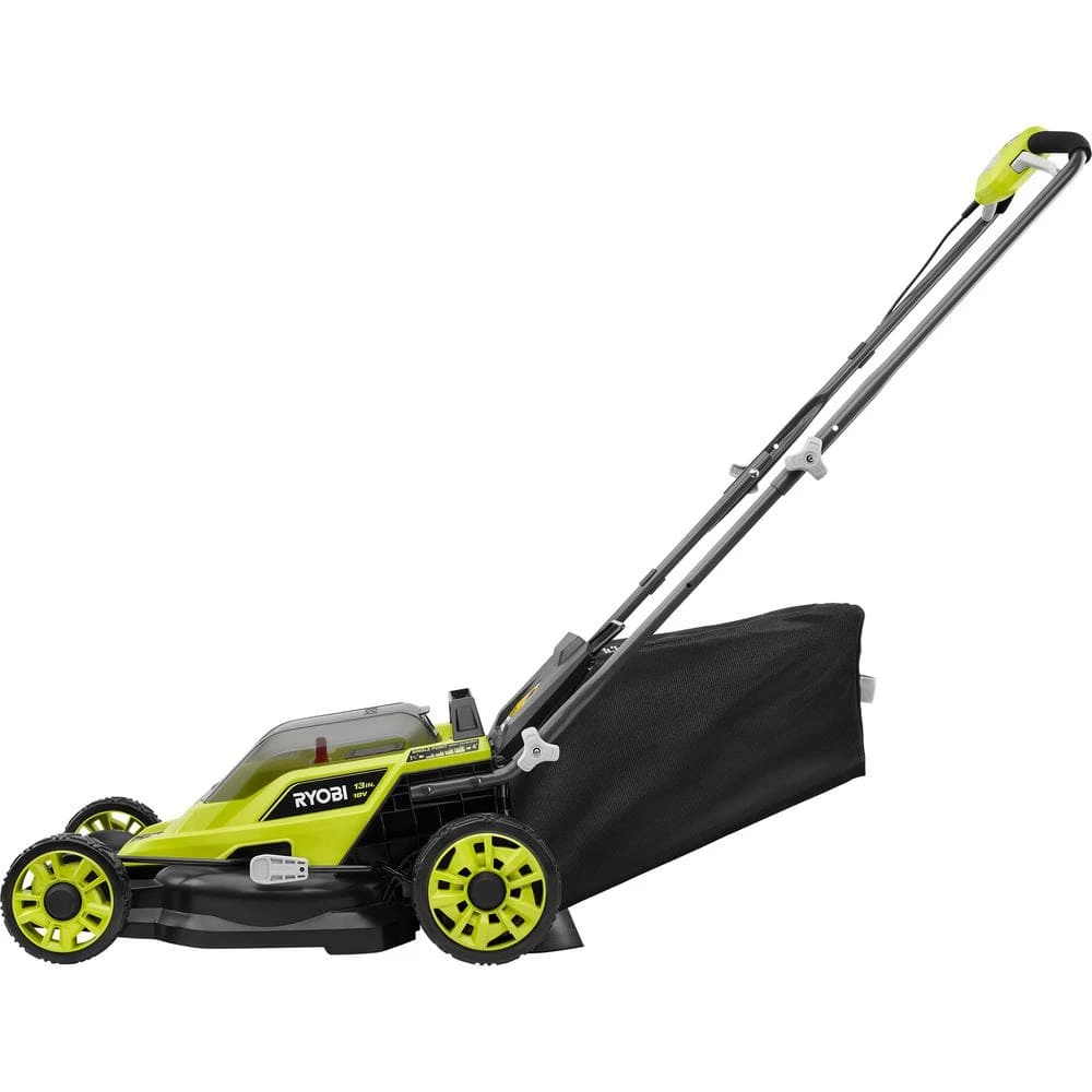 The RYOBI 18V ONE+ Cordless 13″ Mower easily starts with the push of a button and mows up to a ¼ acre or up to 30 minutes on a single charge. Simply insert the included battery and you’re ready to mow in seconds without the hassle of gas or oil. This mower features a single point height adjustment, 2-in-1 mulching and bagging functions, and easy lift bag removal. The compact, lightweight design makes it easy to carry from one place to another, and the handles fold for convenient, vertical storage when the job is done. The RYOBI 18V Cordless 13″ Mower includes an 18V ONE+ 4.0 Ah battery and charger and is backed by a 3-year warranty.