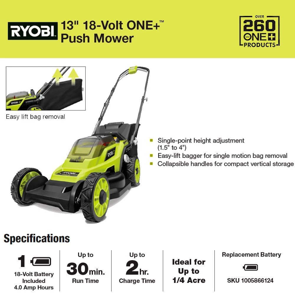 - Includes RYOBI 18V Lithium 4.0 Ah Battery and Charger