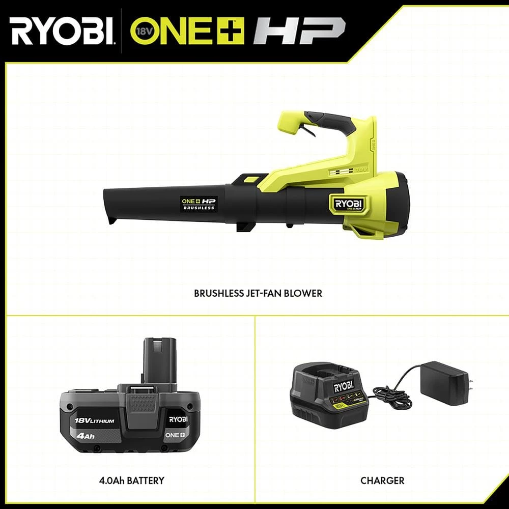 The RYOBI 18V ONE+ HP Jet Fan Blower is the perfect tool for fall cleanup. Simply insert the 18V battery and pull the trigger to start. The premium HP brushless motor provides more power, longer runtime, and a longer motor life. This blower is ideal for light to medium duty use like blowing leaves and light debris. The lightweight design is perfect for users who need a powerful, lightweight option. This handheld blower features a variable speed trigger for more control while cleaning around the home. The jet fan design increases airflow by delivering 350 CFM and 110 MPH of clearing power, allowing for a quick and easy clean up. This blower is also equipped with a 4.0 Ah battery and charger that are compatible with over 260 RYOBI 18V products. This tool is back by a 3-Year Limited Warranty.