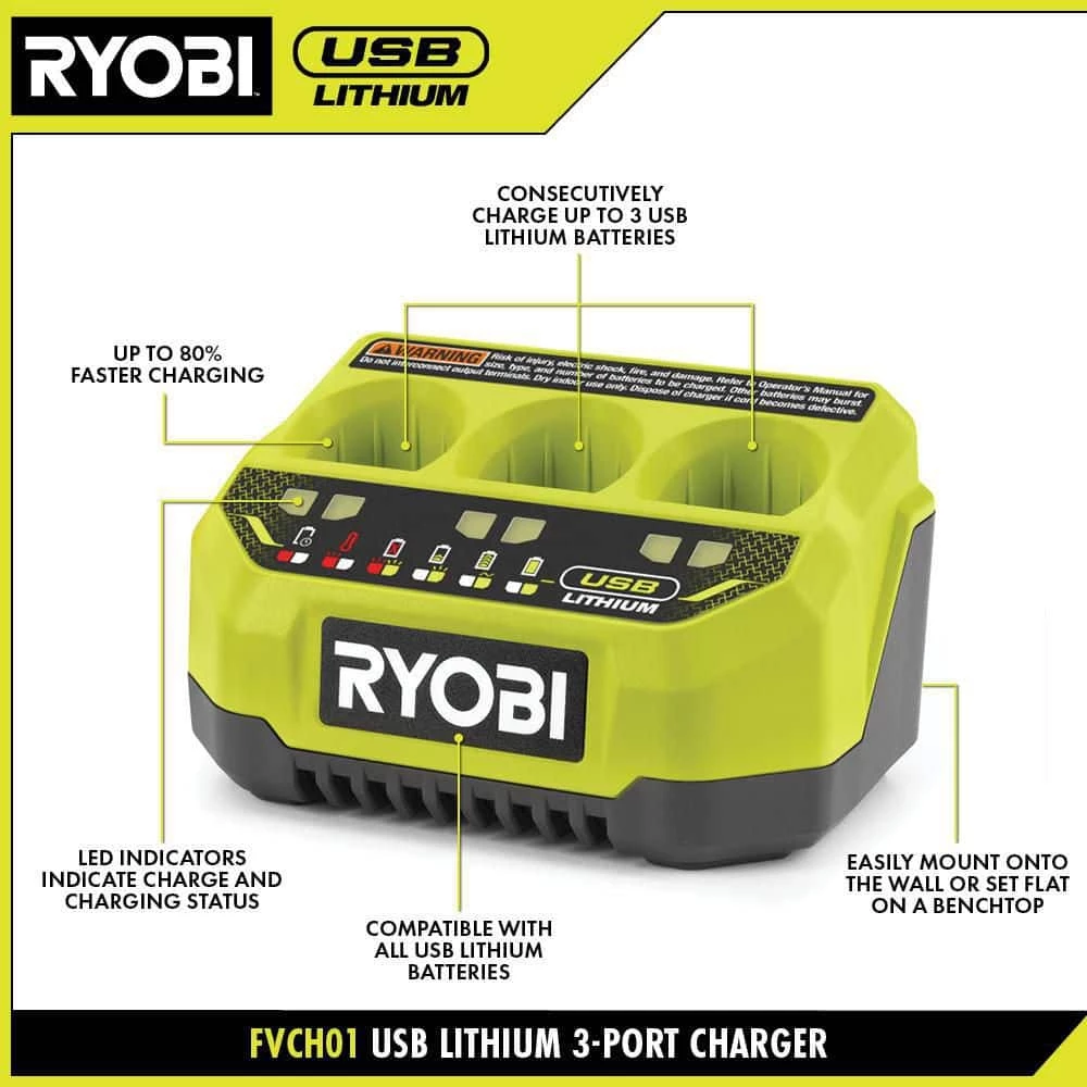 - Charger: 3 ports for sequential charging of batteries in the RYOBI USB Lithium Line