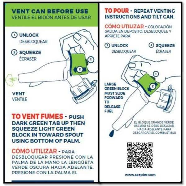 The Scepter SmartControl fuel containers are the next generation of rugged gas cans that provide you with a fast and hassle-free experience. This 5 Gal. can features a simple spout and flame mitigation device, this product eliminates frustration with an easy-to-use, hard-to-break design with an added layer of protection. The Scepter SmartControl gasoline container also has a squeeze controlled flow rate which makes filling everything from lawnmowers to recreational vehicles a simpler, cleaner, safer experience.
