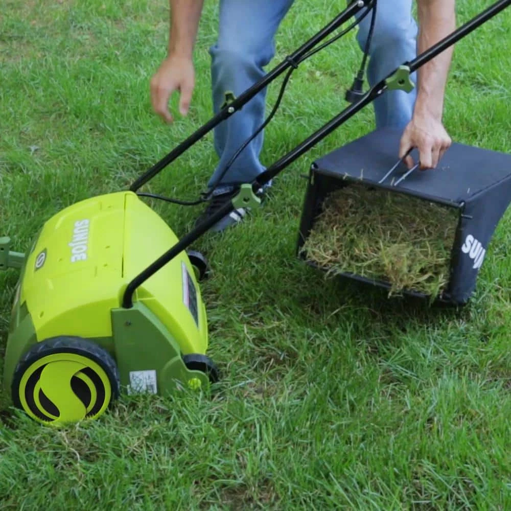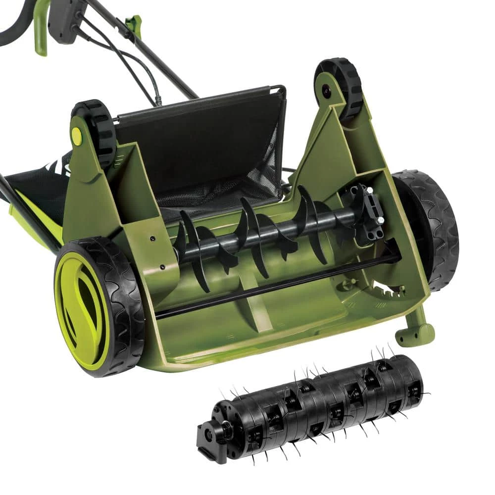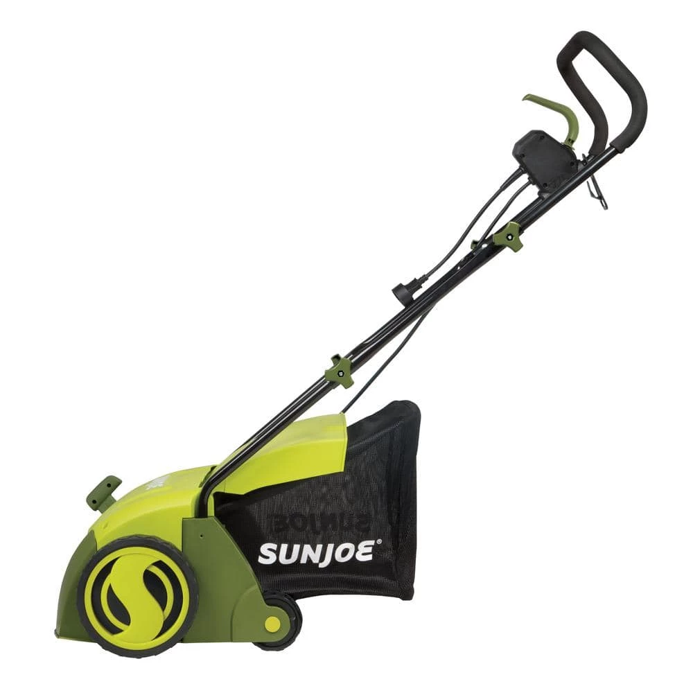 Get your lawn in top green shape with the Sun Joe Dethatcher Joe AJ801E 13 in. electric scarifier + lawn dethatcher. Powered by a robust 12 Amp motor, the Dethatcher Joe rakes a 13 in. W path in a single pass to get your job done fast. Enhancing its raking ability is AirBoost technology, which maximizes thatch pickup with spring steel tines that stay sharp longer for reliable performance. Use the 5-position depth control knob to tailor the raking depth from 0.4 in. (10 mm below the soil) to 0.4 in. (10 mm above the soil), depending on your lawn’s scarifying or dethatching needs. Scarifying your lawn at regular intervals cuts grass roots and encourages growth for thicker, healthier turf. Thatch is a dense mat of roots, stems and grass clippings that accumulates on lawns over time, blocking the flow of water, oxygen and vital nutrients. It is important to periodically remove thatch in order to keep your lawn green and healthy. While ordinary manual rakes are tiresome to use and not very effective, the electric Dethatcher Joe starts instantly with the push of a button and easily gets the job done without polluting the atmosphere with toxic carbon emissions. No gas, oil or tune-ups make the Sun Joe Dethatcher Joe your green choice for greening your lawn.