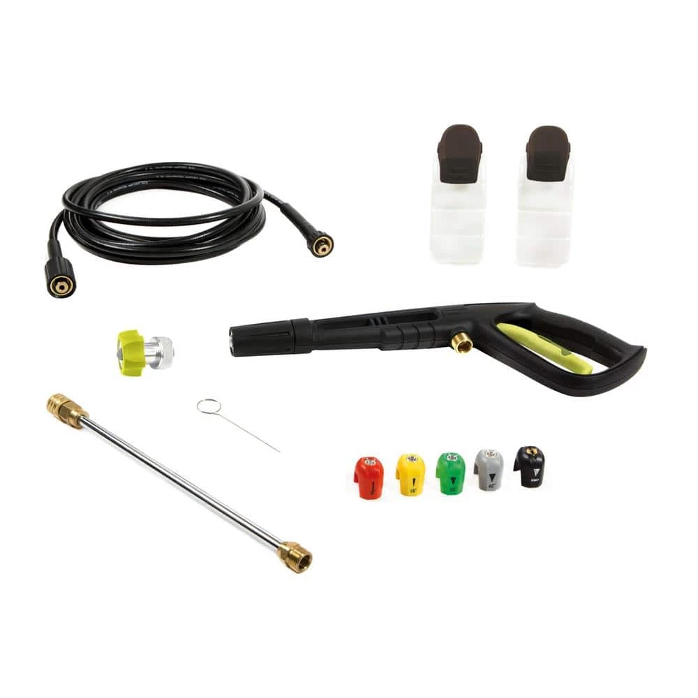 - Includes a 34 in. extension wand, 20 ft. high pressure hose, 35 ft. power cord with GFCI protection, garden hose adaptor, needle clean-out tool