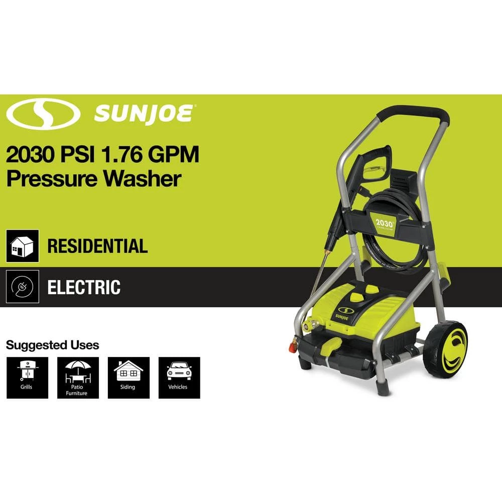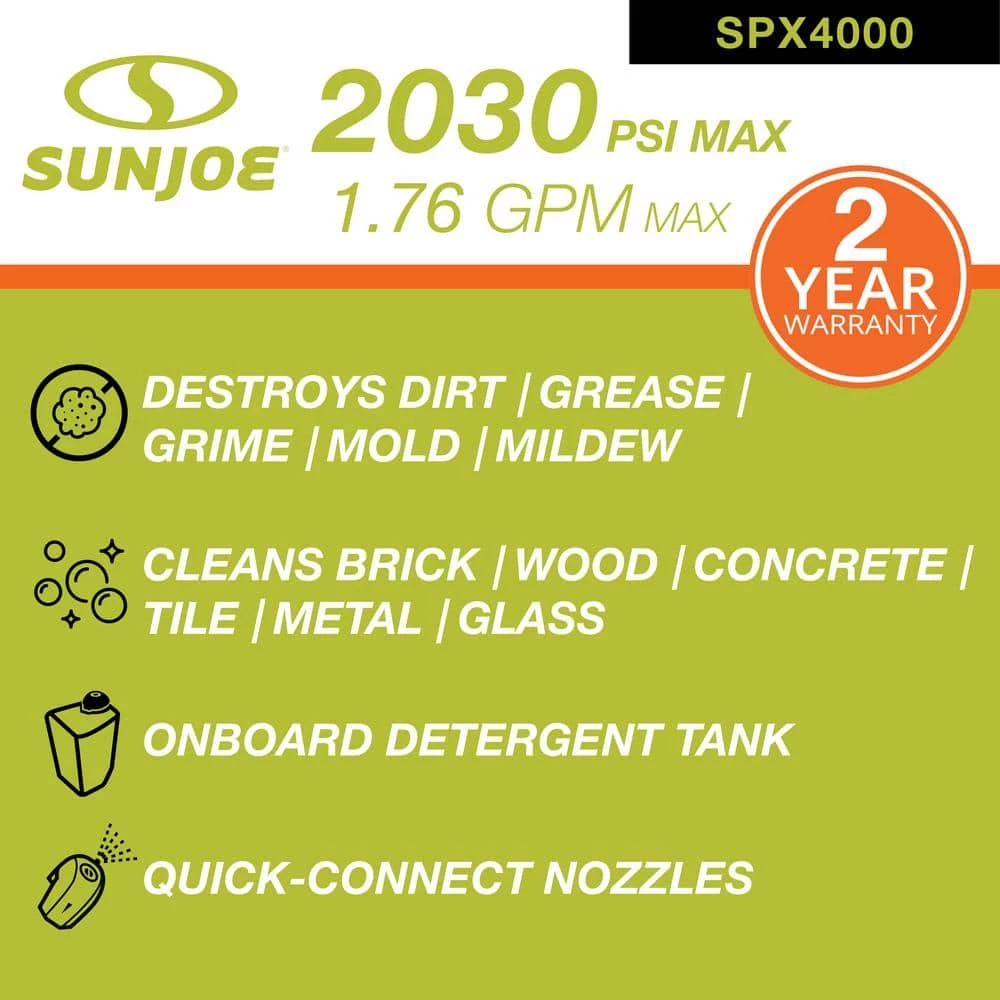 Tackle your toughest home, outdoor and auto cleaning projects with ease with the Sun Joe SPX4000 Electric Pressure Washer. Packed with 1800-Watt of pure power, the 14.5 Amp motor generates up to 2030 PSI to demolish every last bit of dirt, grease, gunk and grime. Five Quick-Connect tips allow you to go from intense jet to gentle spray to suit the cleaning task and the onboard 54.1 fl oz. detergent tank lets you dial-in just the right amount of detergent to give your cleaning blast a boost. Featuring Sun Joe’s exclusive Pressure-Select Technology, the SPX4000 lets you pick the perfect pressure to combat dirt and grime with professional results and a Total Stop power-saving system designed to save energy and prolong pump life when the trigger is not engaged. Cut your outdoor cleaning chores down to size and Go With Joe – the SPX4000 Electric Pressure Washer from Sun Joe. Get Equipped.