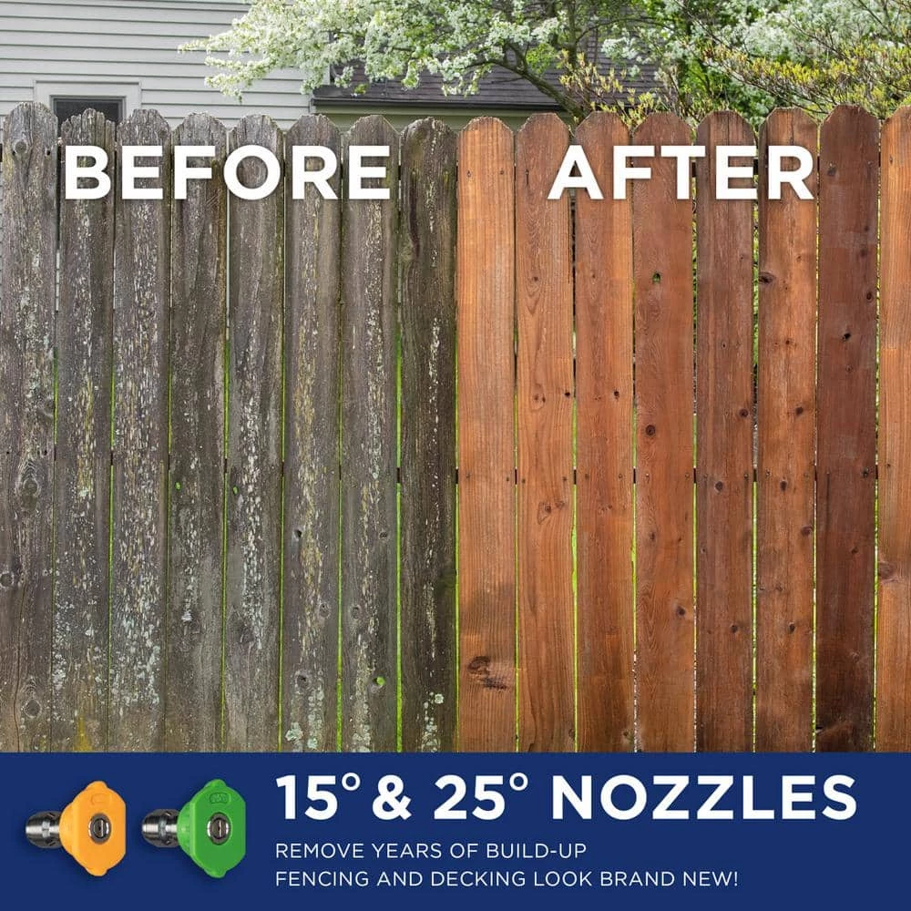 - 5 quick connect nozzles: 0°, 15°, 25°, 40° and soap applicator tip for adjustable spray