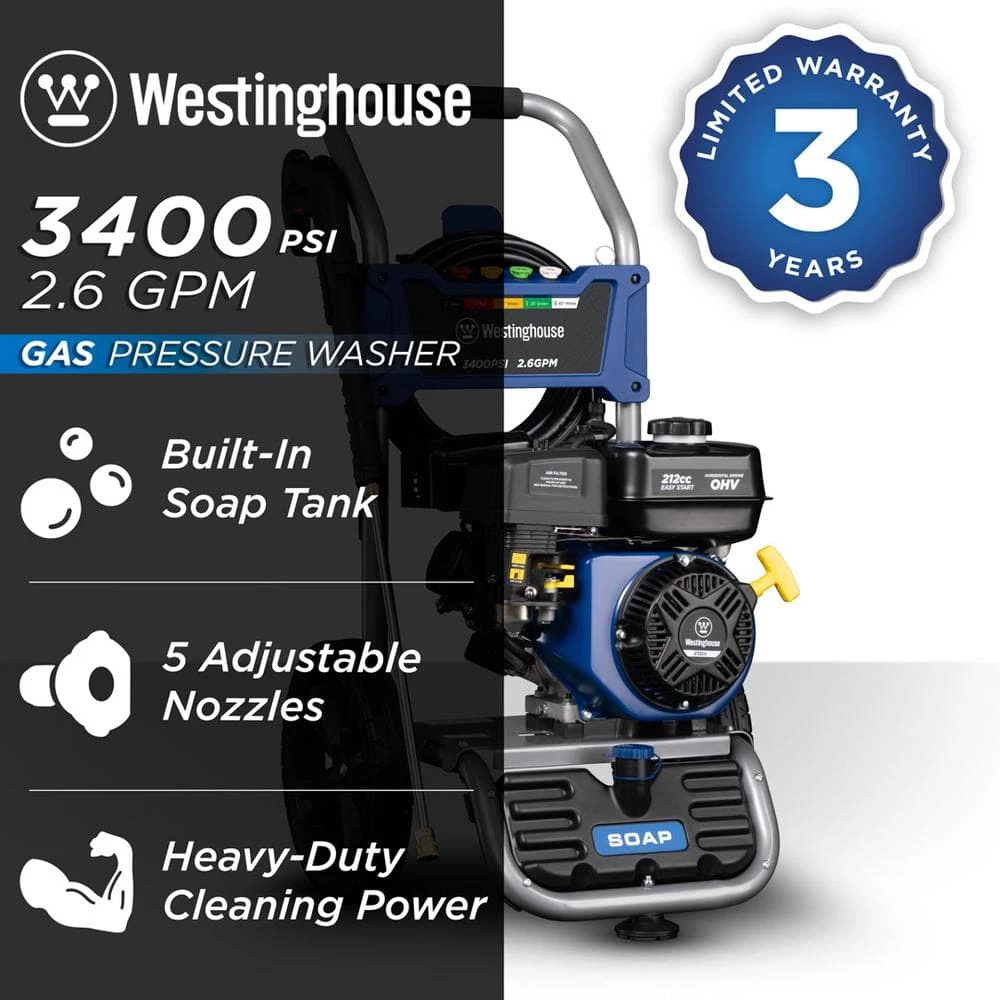 The Westinghouse WPX3400 Gas Powered Pressure Washer, with 3400 PSI and 2.6 GPM, is designed to tackle your toughest cleaning jobs with ease. Built with a powerful 4-cycle OHV Westinghouse Engine and a maintenance free axial cam pump, it’s meant for powerful heavy-duty cleaning. With 5 interchangeable nozzle tips and a built-in 1.6 L soap tank, the WPX3400 has the versatility to handle a variety of situations and surfaces including brick, stone, concrete, wood, aluminum and iron. The 3.3 L fuel tank and never-flat wheels offer easy mobility and maneuverability, allowing you to get into those hard-to-reach places with the toughest grime. Make all your deep-cleaning projects easier than ever before with the Westinghouse WPX3400 Pressure Washer.